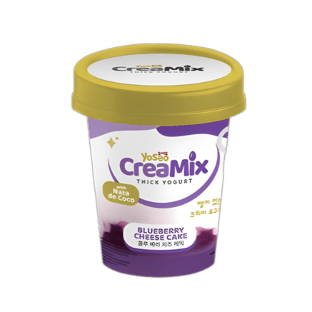 Fresh milk (65%), nata de coco (18%), water, sugar, skim milk powder (1%), anhydrous milk fat, vegetable stabilizer (vegetable, bovine gelatin), synthetic cheesecake flavor (contains natural flavor of steviol glycoside), synthetic strawberry flavor, blueberry puree (0.1%), natural anthocyanin color, lactic acid bacteria culture (Streptococcus thermophilus and Lactobacillus delbrueckii subsp. bulgaricus).